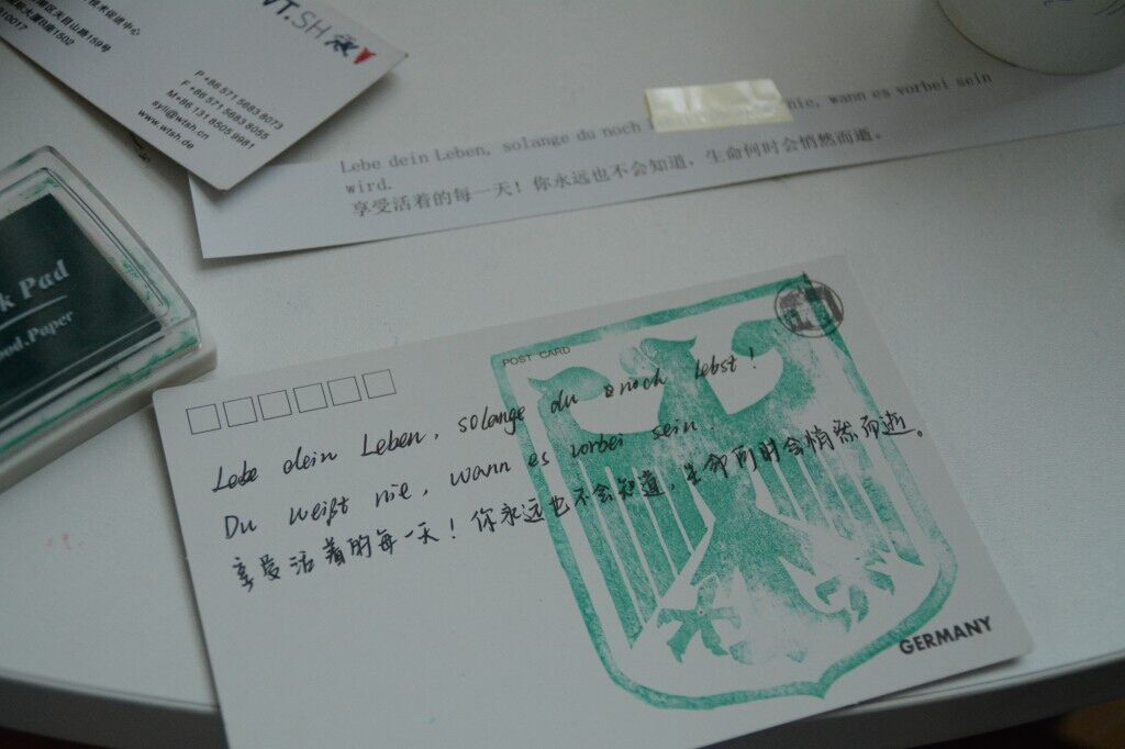 图为同学们准备的写有德语谚语和盖有德国国徽的明信片