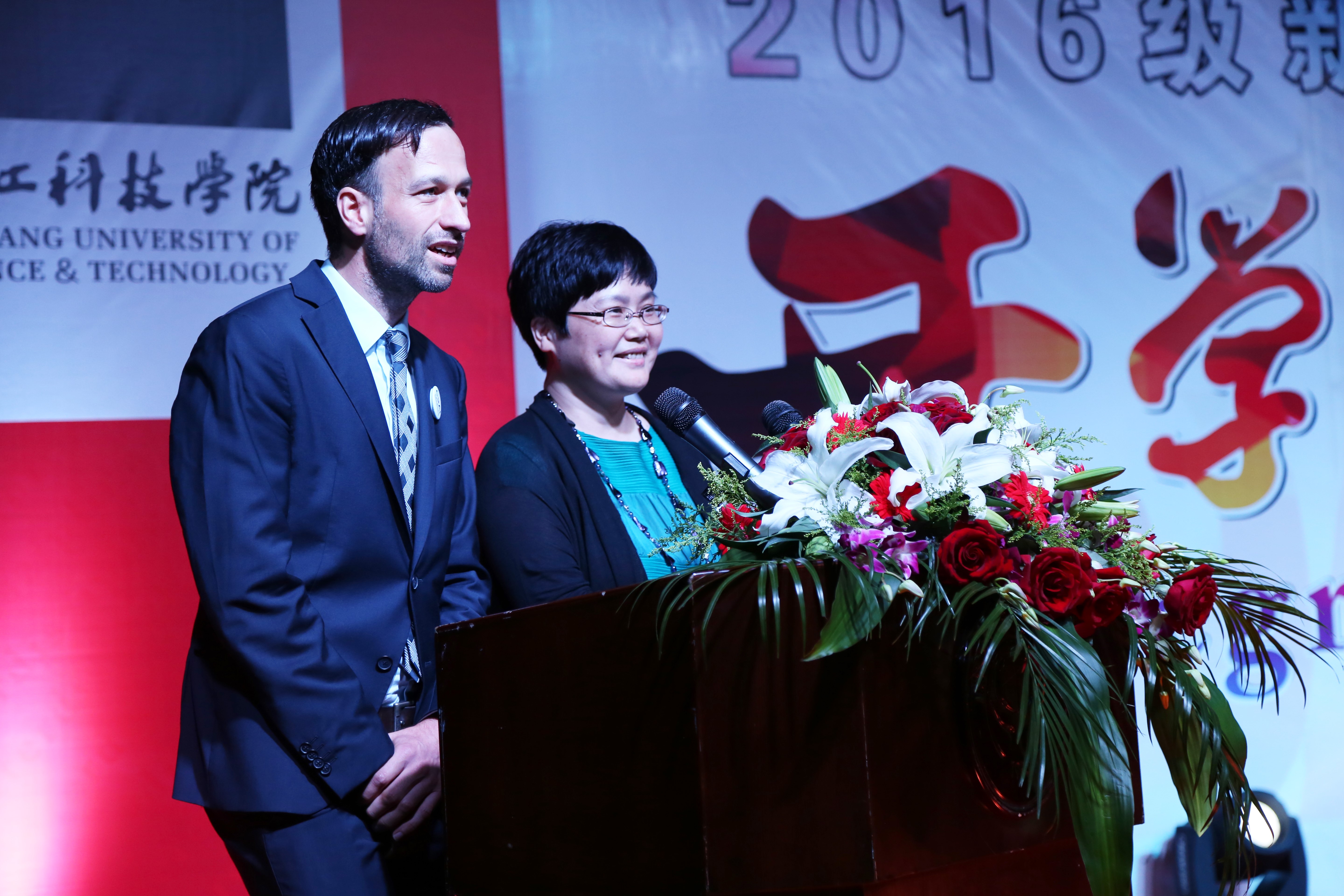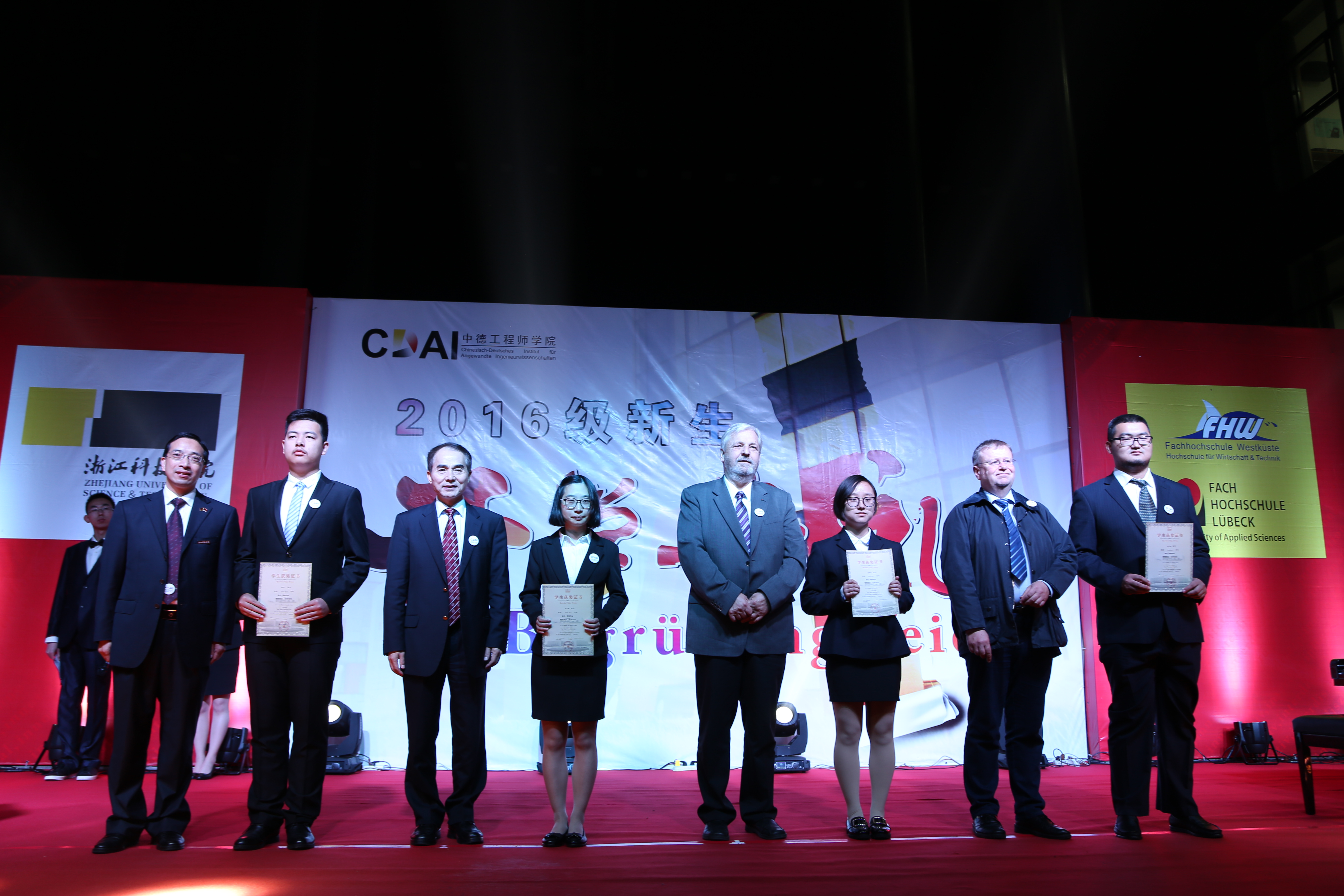 2016年11月6日晚,浙江科技学院中文无码 2016级新生开学典礼在浙江科技学院安吉校区中德楼隆重举行。德国西海岸应用科技大学校长哈诺·科尔希(Hanno Kirsch)、吕贝克应用科技大学副校长约翰森·利兹(Joachim Litz)、我校校长叶高翔、副校长冯军、副校长郑友取、校长助理鲁伟权出席。中文无码 领导、学校相关职能部门领导、中德双方教师、学院老生代表和学院全体16级新生近200人参加此次盛会。
