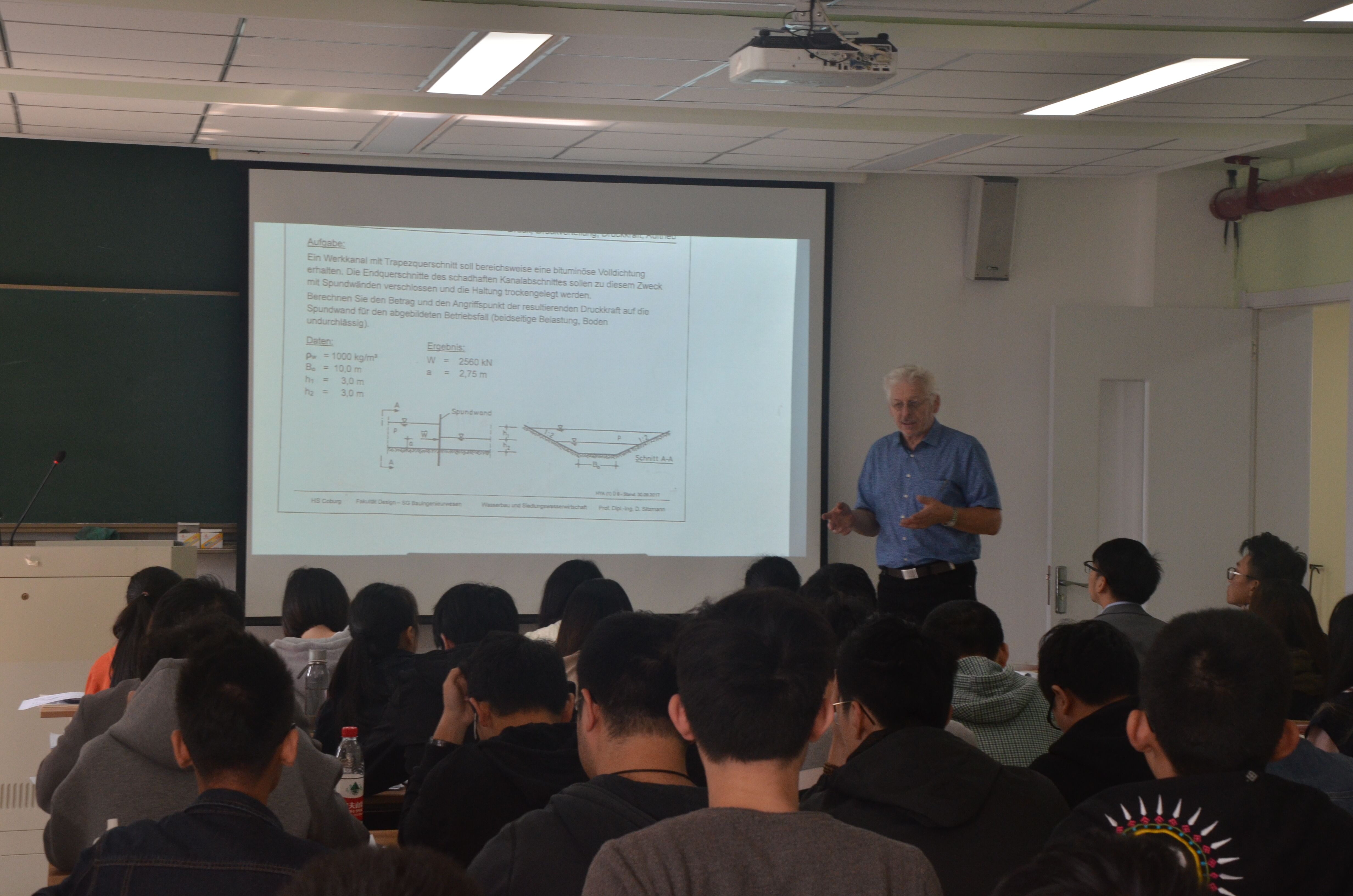 10月23日上午,来自德国科堡应用科技大学的迪特尔•舒兹曼教授开始为中文无码 15级土木的同学讲授为期两周的《流体力学》课程。这是15级土木专业的同学们第一次经历的德方教授集中授课,同学们非常重视这次集中授课,部分同学在暑假就花时间查询整理了该门课程的相关德语专业词汇,以便于更好地理解这门课程。