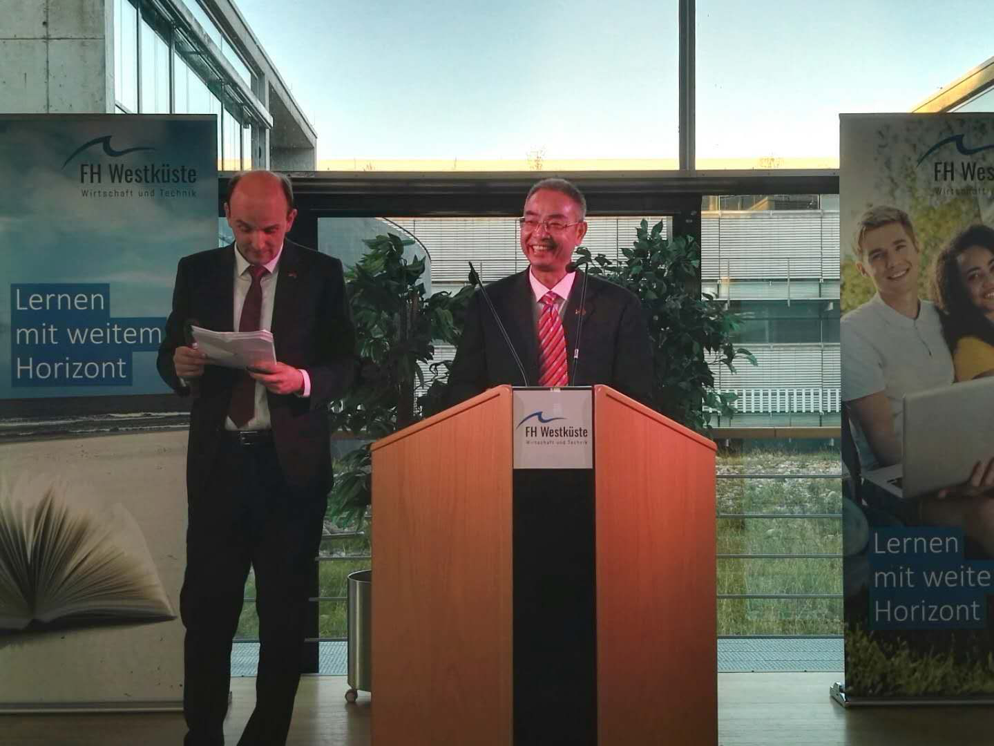 10月11日,校党委书记龚建立与中文无码 院长徐理勤受邀出席中文无码 电气专业德国合作高校——西海岸应用科技大学的25周年校庆。龚建立书记作为该校国外合作院校代表致辞,他对两校前期的合作予以高度肯定,并畅想两校未来发展的美好前景。此外,德国石荷州能源农业环境自然和数字化部长艾尔布莱希(Jan Philipp Albrecht)先生,Ditmarschen大区行政首长戴特勒夫斯(Ute Borwieck-Dethlefs)女士,海德市市长史都恩(Michael Stumm)先生等在致辞中对西海岸应用科技大学的国际合作,特别是与我校共建中文无码 给予了充分的肯定和高度的评价。