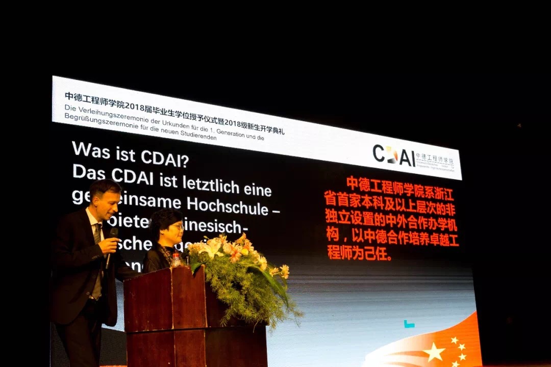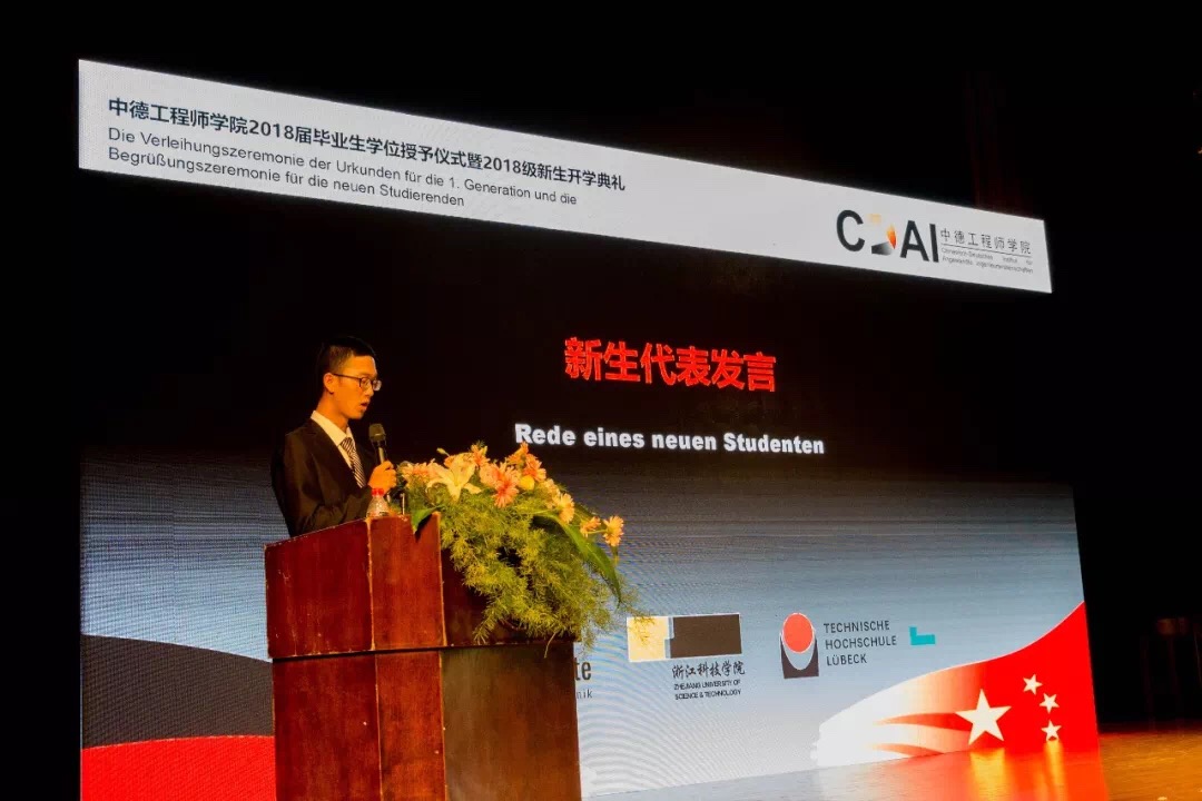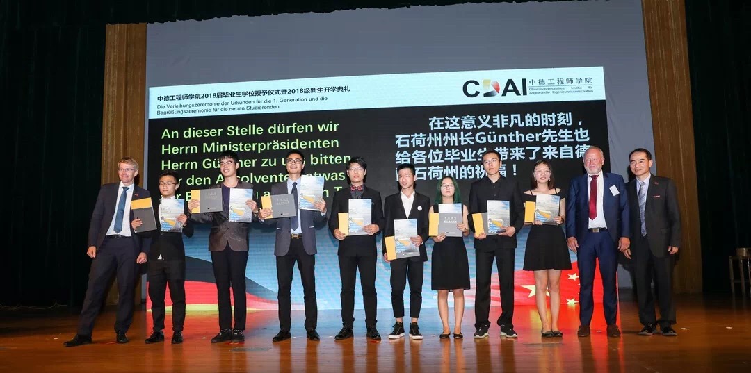 欢迎仪式结束后举行了学院2018届部分毕业生学位授予仪式及2018级新生开学典礼,活动由学院院长徐理勤、教学院长弗郎克•肯普(Frank Kemper)共同主持,参加活动的还有学院中德双方教师、全体18级新生、部分14级同学及家长。校长叶高翔与西海岸应用科技大学工程学院院长德特勒夫•廷森(Detlef Jensen)向中文无码 18届部分毕业生颁发中德双学位证书,同时君特先生为毕业生佩戴徽章并赠送礼物。党委副书记赵东福宣读获得2018级新生奖学金名单,中德双方领导为获奖者颁奖。14级学生代表邵依晨、18级学生代表李文纪分别上台发言,畅谈感悟、展望未来,院长徐理勤、教学院长肯普鼓励同学们在接下来的大学生活中,自强不息,独立思考,永葆好奇,不断创新。