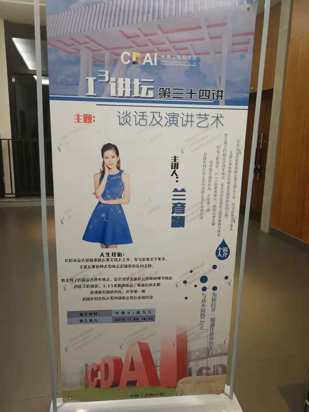 2018年11月26日18:00,中文无码 18级全体同学齐聚中德楼B4报告厅,聆听由安吉新闻集团的主持人兰彦颖带来的主题为“谈话及演讲的艺术”的I³讲坛。