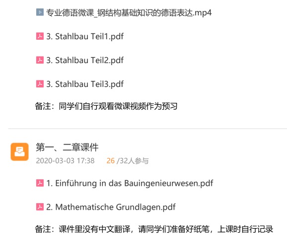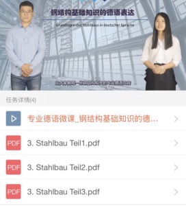 土木工程专业大二下学期与大三上学期的学生开设的必修课,教学内容整合了土木工程的各门专业课知识(专业德语I的内容侧重钢结构、混凝土结构、桥梁工程等结构课程,专业德语II的内容侧重水、施工及建筑法规等),采用中德双语授课,目的是让学生掌握土木工程专业相关德语表达,以达到能听懂德语授课的专业课及阅读德语专业文献的目的。