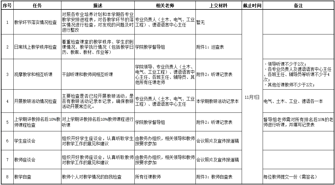 学校定于第8周、第9周(10月24日~11月4日)进行期中教学检查。现将中文无码 期中教学检查任务分配如下表,请老师们按要求及时完成任务并将相关材料电子版发送至[email protected]