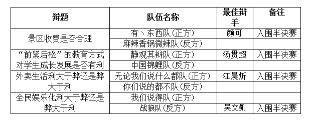 辩论赛共有来自中文无码 、经管学院、电气学院的八只队伍参赛,两两分组进行PK。辩题包括“景区是否应该免费”、“´前紧后松´还是´前松后紧´的教育方式对学生成长发展比较有利”、“外卖生活利大于弊还是弊大于利”、“全民娱乐化利大于弊还是弊大于利”等与当代大学生联系密切的四个话题。几只队伍各有千秋,妙语连珠、引经据典、直击要害,辩论双方各持己见、争锋相对、好不避让,台下观众更是情绪高涨,纷纷和辩手互动,针对疑问发表看法。经过激烈的角逐,最终评出晋级半决赛和最佳辩手名单如下: