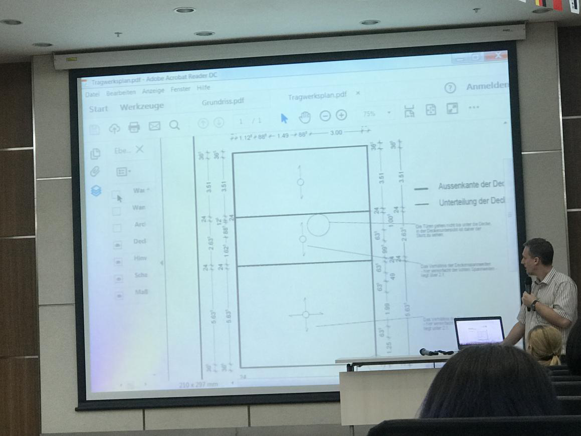 此外,Jungwirth教授还给同学们做了以桥梁工程为主的专题报告,介绍了不同国家的工程项目,其中有北京-上海铁路线上的南京长江大桥设计、杭州-长沙铁路线上的无砟轨道设计、多哈地铁线上的桥梁设计及已有桥梁的维修与加固、毛里求斯的斜拉索桥设计、建筑信息模型在教学上的应用等。教授以桥梁的实际工程为例跟学生强调,对于结构设计,要根据不同国家的国情来进行。