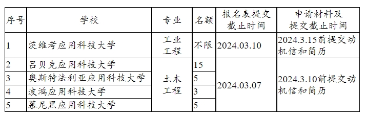 2. 土木工程专业申请表中有2个志愿,请同学们仔细考虑后填写,可不填满。工业工程交换院校为茨维考应用科技大学。